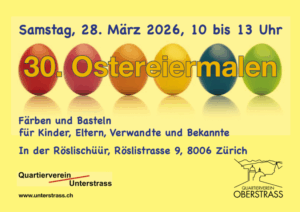 Ostereiermalen: Samstag, 28. März 2026, 10.00 bis 13.00 Uhr Am kommenden Samstag, 28.03. findet das jährliche Ostereierfärben in der Röslischüür statt.